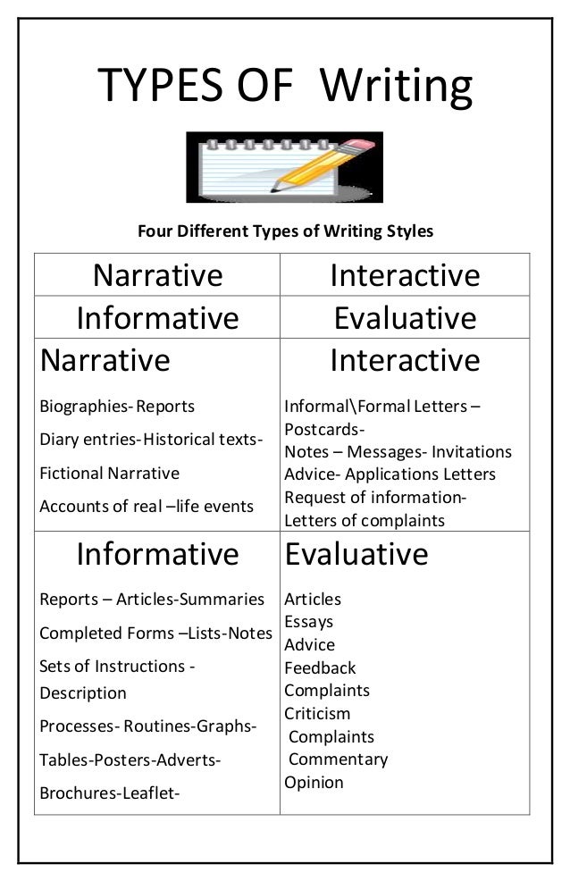 Here are the guidelines for formatting a paper in Chicago style. One inch margin on all sides of the paper. Double spacing everywhere. Text style should be Times New Roman 12pt. Include the last and page number in the header of every page. Include the last and page number in the header of every Essay Writing Receive a customized essay written to your teacher’s specification in your inbox before your deadline. Your assignment will be delivered on time, and according Types Of Essay Writing Styles to your teacher’s instructions ORDER NOW 5/5/ · There are four main types of writing: expository, descriptive, persuasive, and narrative. Each serves a specific purpose and differs from the others in particular ways. Knowing the difference between the writing styles is useful in essay writing because your essay must serve a precise purpose. By understanding the subtleties of the writing styles, it will be a lot easier to determine which style to